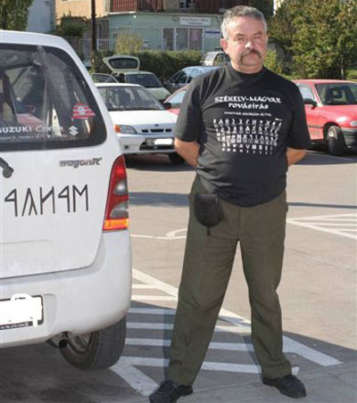 A piricsei szószékTudomásunk szerint ő volt az első, aki nevét rovásírással írta az autójára, örömmel számolt be róla, ha ebben követőkre talált.