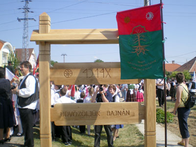 Alig egy hét múlva, május 9-én Bajna fogadta a vendégeket, ahol a Magyar Viselet Napja rendezvény keretében szemet gyönyörködtető ruházatok kápráztatták el a mintegy kétezer érdeklődőt. Az egész napos műsor részeként került sor a rovásfeliratos helységtábla avatására, amit megtisztelt jelenlétével Dr. Völner Pál, a Komárom-Esztergom megyei közgyűlés elnöke is. A korábban táblaállító Szigetszentmiklóst a Tölgyfa Egyesület népes küldöttsége képviselte és ajándékozta meg rovásfeliratos nyílvesszővel a bajnai kezdeményező Pallagi Tibor polgármestert, aki többedmagával, a székely nemzeti lobogót lengetve vonult végig a település főutcáján. A jelenet minden bizonnyal meghatotta a rendezvény díszvendégeit, akik a pártiumi Kalotaszegről érkeztek. A polgármesterrel közösen a Magyar Viselet Napját ötletgazdái, Reiter Szilvia és Balla Gyöngyi jó érzékkel kapcsolták össze a táblaavatással, így annak történetében az eddigi legnagyobb tömeg lehetett szemtanúja az eseménynek.