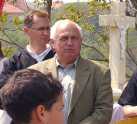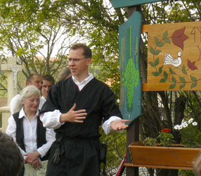 Kovács József plébános megáldja a rovásfeliratos táblát Baksza Pál és Szakács Gábor jelenlétében |