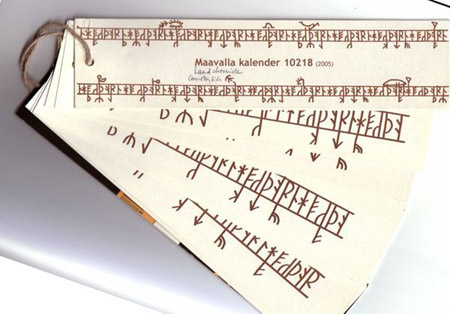 A fényképen egy észt runa naptár látható, mely napjainkban is forgalomban van, Lukács Ágnes hozta Észtországból. Az eredetieket fára rótták.