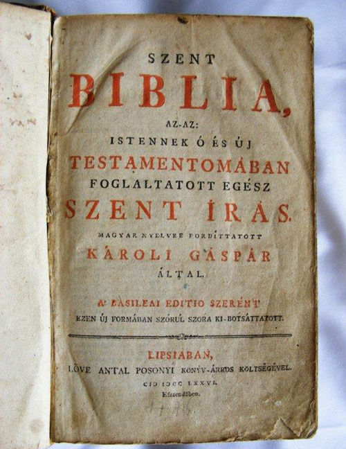 Szent Biblia az-az: Istennek Ó és Új Testamentomában foglaltatott egész Szent Irás. Magyar nyelvre fordittatott Károli Gáspár által. A Basileai editio szerént ezen új formában szórúl szóra ki-botsáttatott. Lipsiában, Löve Antal Posonyi könyv-árros költségével. MDCC LXXVI. Esztendöben.