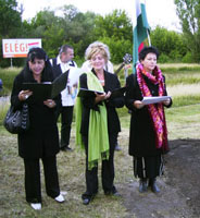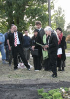 Tampó-Ababei József, csángó-magyar katolikus pap áldása, jobbról a Rákosmente Polgári Kör vezetője, a táblaállítás hivatalos kezdeményezője |