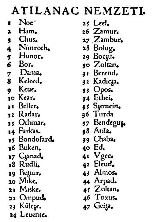 című művét, amelyben a leszármazás: Noé, Jáfet, Kám, Kús, Nimród, Hunor Bor...