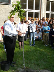 Fát ültet Badiny Jós Ferenc emlékére, a rovásversenyt szervező Munka Utcai Magyar Tanítási Nyelvű Alapiskolában |