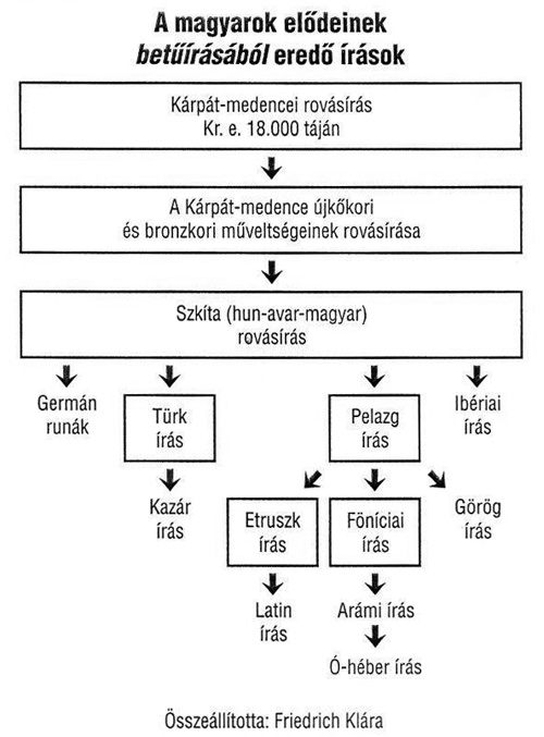 Ebből a Kárpát-medencei igen régi írásműveltségből (Bajót, Tordos-Vinca) fejlődtek a bronzkori, majd a szkíta, hun, avar, magyar írásjegyek, lásd 1. kép. Ennek az írásnak a folytonosságasoha nem szakadt meg, hiszen ma is százezerre tehető azoknak száma, akik mindennapjaikban használják közlésre, díszítésre. Bizonyíték ezarra is, hogy amagyarok a Kárpát-medence őslakói és nem csak 896 óta élnek itt. 4. KÉP-TÁBLÁZAT