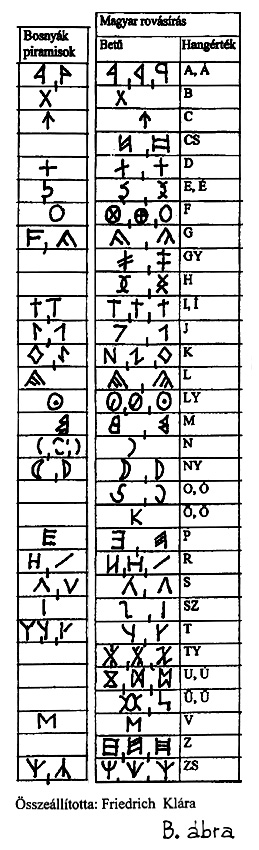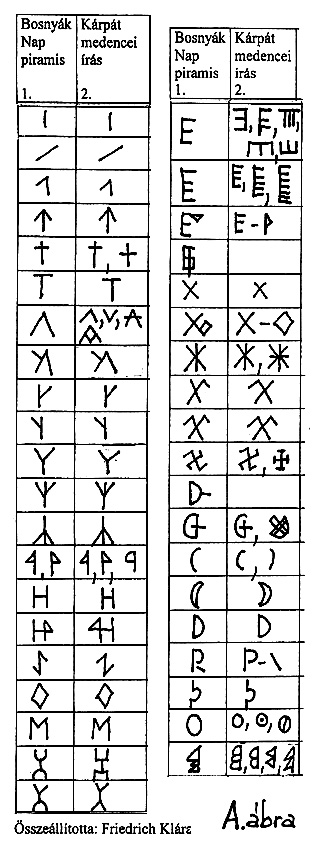 Több táblázatot készítettem a boszniai, a kárpát-medencei, valamint más ősi műveltségek jeleinek összehasonlításával, melyek különböző könyvekben jelentek meg, ezekből itt csak két egyszerűsített formát mutatok be.
