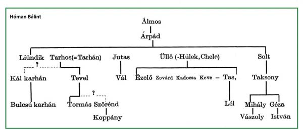 "A karhán vagy tarhán tisztsége pedig - úgy látszik - a legidősebb Árpádfi, Tarhos vagy Tarhán, családjában volt örökletes; Kál és Bulcsú karhánok és a helyükbe lépő Koppány mindenesetre az ő rokonainak látszanak. Tas és Lél a második fiúnak, Üllőnek (Hülek) a leszármazói..." (60.)