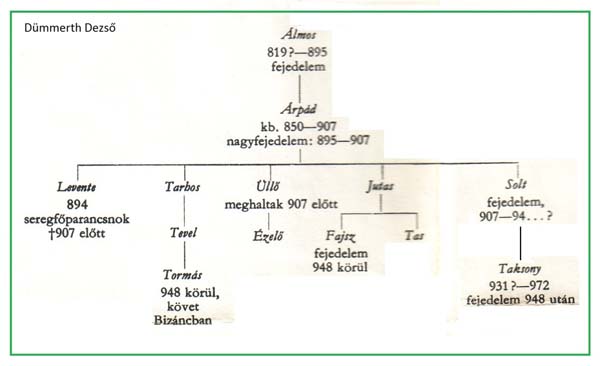 "Hármuk, Tarhos, Üllő és Jutas neveit csak a Bizáncban járt magyar követek elbeszélése, elsősorban a Konstantin császárral beszélő Tormás tartotta fenn, aki Tarhosnak Tevel nevű fiától származó unokája volt." Táblázatán Árpád fiai: Levente, Tarhos, Üllő, Jutas, Solt. (119.)