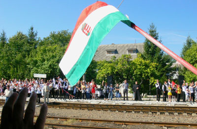 és Oroszi József polgármesterA pár percre lévő szlovák-ukrán határon szokatlan állapot fogadott. A szlovák oldalon ugyanis nem településen, hanem a nyílt pályán felállított őrbódénál történt a schengeni határellenőrzés. A két országot ukrán részről ma is elválasztó nyílegyenes szögesdrót, valamint gereblyézett határsáv elhagyása után futott be a szerelvény Csap pályaudvarára. Az elmaradhatatlan ünnepi fogadtatás után kissé lejjebb hagyott a lelkesedés, amikor a Beregszászig tartó harminc kilométer megtételéhez másfél óra kellett, ám még ennek a csigalassúságnak is volt előnye: hosszabban integethettek egymásnak az út menti települések és a szerelvény magyarjai.