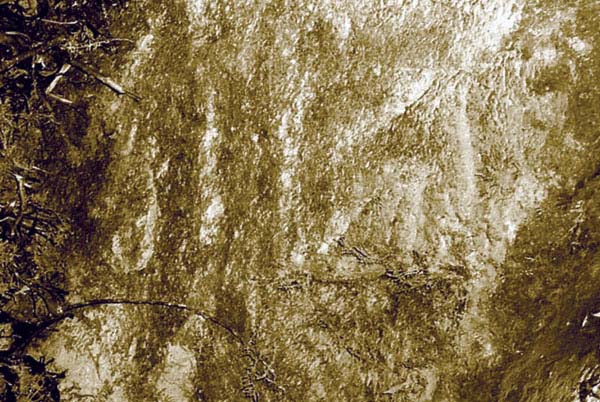 Távolabbról vettem észre a sekély víz útjában álló, a partot és szigetet összekötő kövek sávját, mintha kőhidacska hullámsírba szállt maradványai szürkéllnének ott - vélhetnénk. Közelebb érve, a vízpart felé tartó, cserjék, és öreg fák szegélyezte ösvény kis magaslatra futott ki, mintha hídfő sánca lenne. A gazzal benőtt nedves iszapos talajba kisebb-nagyobb kőtömbök süllyedtek. Ezeket a bővizű folyam takarja, és csak rendkívüli szárazság idején mutatkozhatnak meg. Itt találtam rá az alábbi képeken látható több mázsa súlyú kőtömbre, amelynek látható oldalán rovásjelek kopott véseteire figyeltem fel.