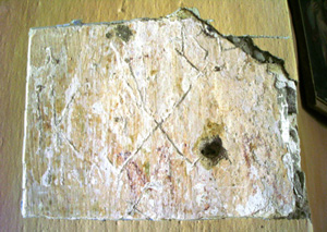 A kápolnában található rovásjelekre dr. Mózes Gyula hívta fel a figyelmemet. A régészek a falkutatás során a vékony meszes vakolatot néhány helyen megbontották és alóla csudák tárultak fel, egy freskórészlet, egy gyönyörű arc, talán Szent László. Továbbá láthatók bekarcolt jelek, a szakirodalomban eddig még le nem írt rovás és latin betűk vegyesen. Vörös krétával, vagy ceruzával írt betűk is feltűnnek, hasonlóan a bögözi felirathoz. Kovács Miklós középiskolás, a 11. Kárpát-medencei Rovásírásverseny egyik győztese elemlámpájával az oltár mögé világítva, ott is rováskarcolatokat vett észre, 2010-ben.