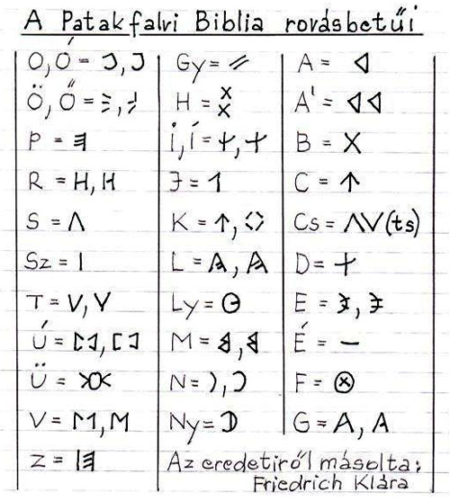 Feltételezem, hogy a Patakfalvi Biblia rovója görögül tudó személy volt, aki az etruszk nyelvvel is foglalkozott. Erre utal, hogy az általa használt A, Á betűk a görög deltának is megfelelnek, T betűje pedig az etruszk V betűnek. A két oldal tartalmánál fogva elképzelhető, hogy székely származású volt.