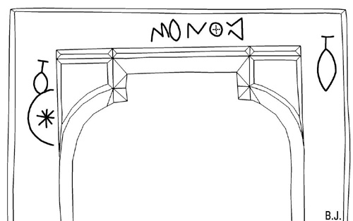 (ha szemből nézzük) lezárt egy kiemelkedéssel a kőgerendán, a jobb oldalon pedig