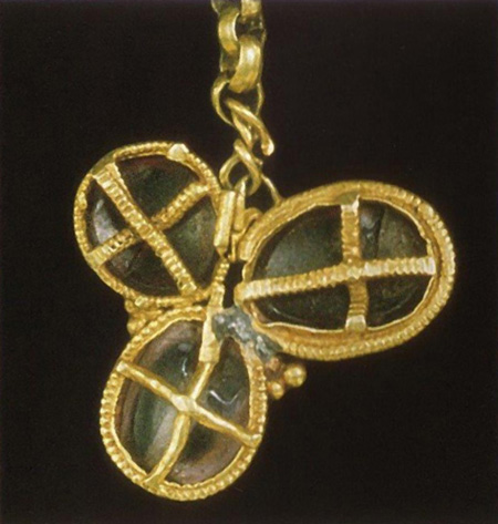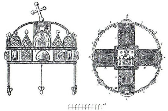Németh Zsolt fizikus Szent Koronáról szóló könyvének olvasásakor, a csüngők hátoldaláról készült színes képnél vettem észre a nagy hasonlóságot az avar kori gallér díszeivel. A szakirodalomban nem olvastam még ezt az észrevételt. Mind a gallér díszei, mind a Korona csüngői ugyanabból a drágakőből, almandinból készültek. Ez a hasonlóság is azt támasztja alá, hogy a Korona a hun, de legkésőbb az avar korban készült.