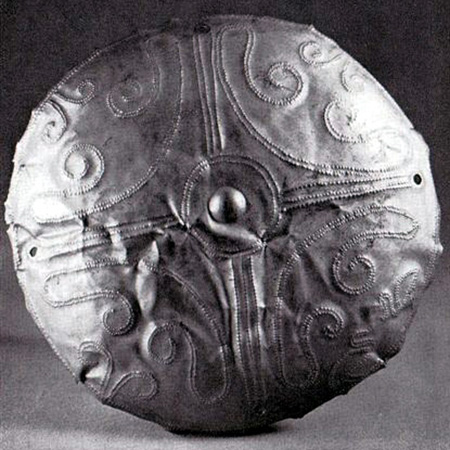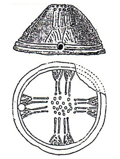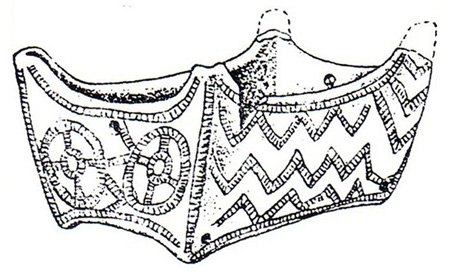 A somogyomi (Erdély) aranykincs korongja (6. kép) és egy Hajdú-Bihar megyei bronzkori agyag kocsimodell (7. kép) is hasonló motivumot hordoz.