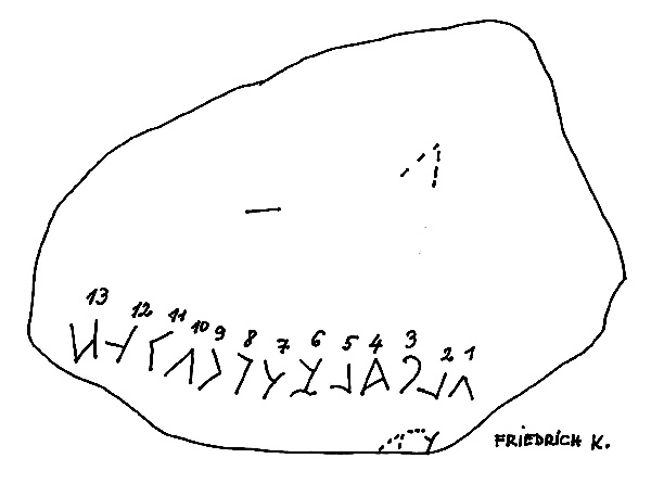 Mivel minden jelnek van Kárpát-medencei párhuzama, feltételezhető jogosan, hogy egy Kárpát - medencei elődünk véste a jeleket a kőbe. Értelmes szövegű megfejtést egyelőre nem adok, elkapkodott lenne, még gyűjtöm a bizonytalan hangértékű jelek párhuzamait. 2011-ben a 2009-es rajzomat annyiban módosítottam, hogy jelöltem a szöveg fölötti különálló rovás S-hez hasonló jelet és más bizonytalan karcolatokat, amelyek keletkezhettek a múzeumba szállítás közben is.