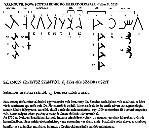 Új Skócia (Kanada) Yarmouth nevű helységében talált rovásírásos kőről a Tomory Zsuzsa által szerkesztett Magyarságtudományi Értesítő 3. számában (1998) olvastam először. Tomory Zsuzsa kereste meg a kővel kapcsolatos kérdéseivel a Yarmouthi Múzeum és Történelmi Kutató Intézet könyvtárát. 1996 december 14-én kapott választ, amelyben a kőre vonatkozó több közleményt ismertettek.