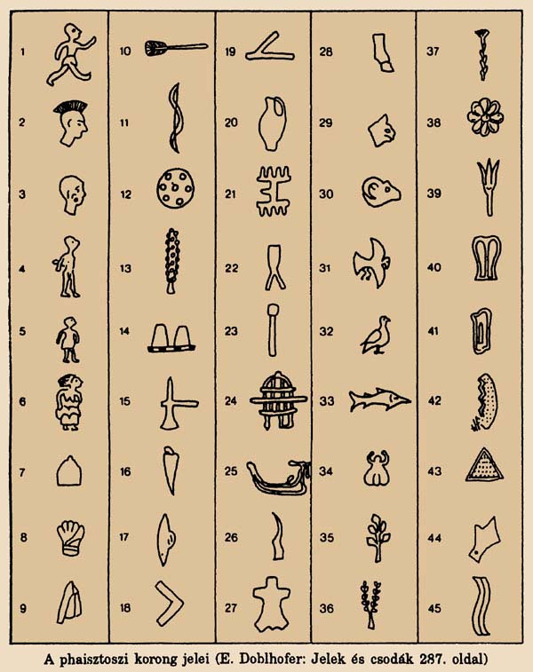 Mielőtt a korong gyakorlati alkalmazásának leírására és megfejtésemre rátérnék, ismerjük meg történetét. A Krisztus előtti II. évezredben Kréta szigetén hatalmas paloták épültek. A knosszoszi után a phaisztoszi volt a legnagyobb. Ennek feltárása során egy toldaléképületben találta meg Luigi Perrier régész a korongot. A szakértők szerint a lelet finom szemcséjű agyagból készült, amely nem krétai eredetű. Jeleit több kutató a krétai lineáris A és B írással hozza kapcsolatba. Kora 3600 év, átmérője 17 centiméter, a jelek nagysága 0.5 és 1.5 centiméter között váltakozik. 45 jelváltozatot tartalmaz, amelyeket Doblhofer ábráján láthatunk. A korong A oldalára 121, a B oldalára 119 jelet nyomtak a puha agyagba, feltehetően pecsétnyomókkal. (Jómagam 122 jelet számoltam az A oldalon, és van még egy készítéskor törlődött, vagy később sérült felismerhetetlen jel is.) Jelenleg az Iraklioni Régészeti Múzeumban látható.