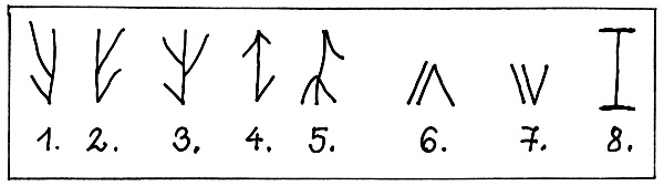 1-1 rovás B vagy 10-es számjegy ( a keresztvonalakkal együtt 100-as vagy 1000-es)