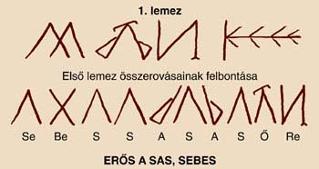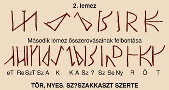 A 2. és 4. lemezen a megfejtetlen szövegrészletre és a kérdőjellel jelzett betűre nem kerestem mindenáron olvasatot. Jelenleg nem találok erre a jelcsoportra magyarázatot és párhuzamot. Úgy gondolom, hogy jobb egy megfejtetlen szöveg, mint egy rossz megfejtés, amely tévútra viszi a későbbi próbálkozásokat. Ugyanezen a két lemezen lévő latin R betűhöz hasonló jel a germán runák között is szerepel. E jel indított arra, hogy megvizsgáljam, nem runafeliratról van-e szó. A 24 runából formailag 13 azonos a rovásírás betűivel, hangértékben azonban nem egyeznek. A runafelirat lehetőségét elvetettem, mert ott az összerovások ritkaságnak számítanak és egyszerűek, valamint a lándzsavégen lévő több jel nem kapcsolható egyik runasorhoz sem, ellenben az ősi magyar rovásírás betűsorába mindegyik beilleszthető, csupán a kérdőjellel megkülönböztetett betű hangértéke bizonytalan. Szakács Gábor szerint ez az É hang rovásjele.