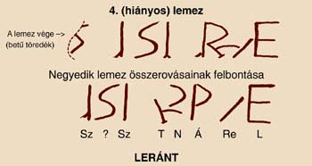A 4. lemez az "E" jellel kezdődik, amelynek balra nyitott változata a rovásírásban "P" hangértékűnek ismert. Forrai Sándor Az ősi magyar rovásírás az ókortól napjainkig c. könyvének (Antológia Kiadó, 1994) 365. oldalán azonban Szekeres Lajos parajdi sóbányász és fafaragó székelykapuján "L" hangértékkel látható.