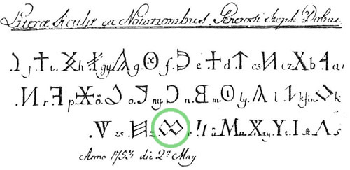 Egy másik ábécében is megtaláljuk ezt a jelváltozatot, 1753-ból, Dobai Istvántól. A hangértéke itt V, mivel a latinban a nagy nyomtatott U betűt a V-vel jelezték, innen a hangérték csere. De semmi esetre sem Q!